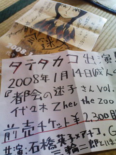 ライブ後、タテさんの物販で来年1月14日の『都会の迷子さん』のチケットを売らせて頂いた。お買い上げになってくださった方、本当にありがとうございました。スタッフさん、いつもいつもお世話になりっぱなしで申し訳ないです。しかも、ライブ中のMCでタテさんがイベントのことに触れてくださった。嬉しかったです。よいイベントになるよう努力しよう。